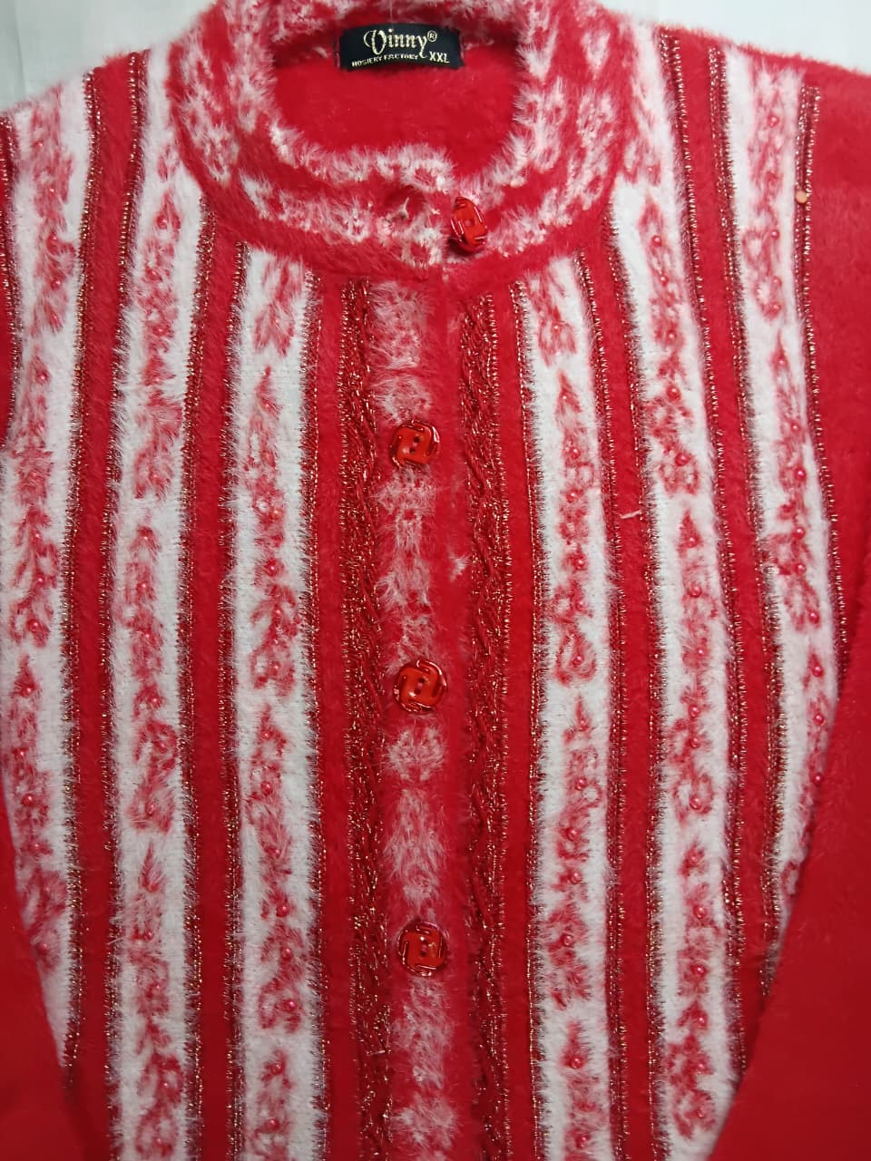 Pattern: Floral / geometric knitted design with bead or thread work on front panel